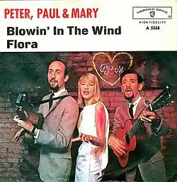 The most commercially successful version is by folk music trio Peter, Paul and Mary, who released the song in June 1963, three weeks after The Freewheelin' Bob Dylan was issued. Albert Grossman, then managing both Dylan and Peter, Paul and Mary, brought the trio the song which they promptly recorded (on a single take) and released.[32] The trio's version, which was the title track of their third album, peaked at number two on the Billboard Hot 100 behind "Fingertips" by Stevie Wonder.[33] The group's version also went to number one on the Middle-Road charts for five weeks.[34] Cash Box described it as "a medium-paced sailor’s lament sung with feeling and authority by the folk trio."[35]
