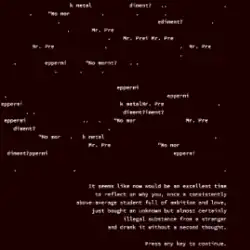 The piece opens at a party, where a man offers the player a bottle of a mysterious green fluid. After drinking it, the PC passes out, but is shortly awoken by a man bringing a phone message from a long-lost love. The game then explores the player's experiences of what may be a hallucination, and may be reality. Notable segments include a fantasy about being elected President in the desert, some "wine" which enhances dancing skills, and a network of tunnels hidden in the back of a freezer.