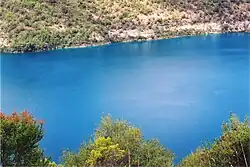 Each November, the lake turns to a deep turquoise colour, gradually returning to a duller blue colour in late February to March.[7] The exact cause of this phenomenon is still a matter of conjecture, but likely it involves the warming of the surface layers of the lake during the summer to around 20 °C (68 °F), causing calcium carbonate to precipitate out of the solution and enabling microcrystallites of calcium carbonate to form. This results in scatter of the blue wavelengths of sunlight. During winter, the lake becomes well mixed, and recent research indicates that during this phase of the colour cycle, the lake is somewhat murkier due to the redistribution of tannins and calcium carbonate particles throughout the lake. Solar elevation has also been found to influence the perceived colour of the lake. The movement of planktonic life forms within the lake during the seasons and during the day may additionally play a part in the colour change.