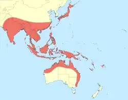 This species can be found in the Australian states of New South Wales, Northern Territory, Queensland, Victoria and Western Australia. It can also be found in Africa: southern Nigeria and Asia: Bangladesh, China, Guangxi, Hong Kong, Hainan, Indonesia, India, Japan, Sri Lanka, Myanmar, Malaysia, Philippines, Peninsular Malaysia, Singapore, Thailand, Taiwan, and Viet Nam.[1][8][9]