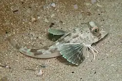 The bluefin gurnard is a bottom-dwelling fish known for its bright red body and large, colourful pectoral fins with a large black eye-spot in the center and surrounded by a bright blue edge.[5][2] Its natural colour is a splotchy pale brown, generally only becoming red when stressed and the belly is paler or even white.[6]