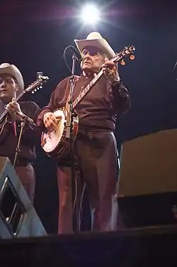 Oh, (Monroe) was the first. But it wasn't called bluegrass back then. It was just called old-time mountain hillbilly music. When they started doing the bluegrass festivals in 1965, everybody got together and wanted to know what to call the show, y'know. It was decided that since Bill was the oldest man, and was from the bluegrass state of Kentucky and he had the Blue Grass Boys, it would be called 'bluegrass.'[38]