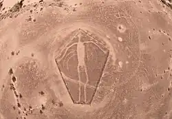 Of the nearly sixty sites containing humanoid figures, almost all of them have a deeply entrenched torso, while the limbs are much more shallowly etched into the surface. Often, the head and/or one or more arms of the figure will not have been represented at all.[7] The largest human figure is 171 feet (52 m) long, while the smallest is 95 feet (29 m) long.[10]