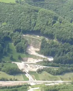 The clearing work for the construction side began in early December 2012. In 2013, an embankment was added between the existing bridge over the L1214 road and the future tunnel portal.[25] The bridge was completed the first building of the new line in 2011 [26] In early 2012, following the site survey the advance was scheduled for mid-2013 [27] The excavation at 'intermediate attack Umpfental' 'began in July 2013.[28] 66 months are provided for the shell.[5] The two tubes should be first built using the NATM. To accelerate the construction, three intermediate points were provided.[1] As part of a plan amendment process in 2008 an intermediate advance was rejected.[29] The planning of 2009 envisaged another intermediate advance in the form of a preliminary window tunnel, to be filled in after completion of the tunneling.[3] The machine advance from the western portal was over a length of 2830 m. An advance from the eastern portal was not undertaken, due to the very steep flanks and environmental considerations.[5] By mid-November 2014, 600 meters of intermediate advance had been completed.[30]