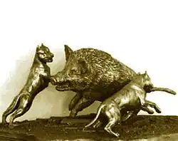 Scholarship recognizes the boar hunting as an example of martial prowess in the Ancient World, but also involves the death of a male hero, sometimes connected to a goddess.[6][7][8]