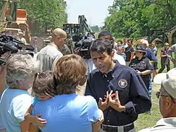 Jindal oversaw one of the largest evacuations in U.S. history (nearly two million people) in late August 2008 prior to the Louisiana landfall of Hurricane Gustav.[68] He issued mandatory evacuation orders for the state's coastal areas and activated 3,000 National Guardsman to aid in the exodus. He also ordered the state to purchase generators to provide needed power to hospitals and nursing homes without power. Government officials vacated hospitals and nursing homes and put the poor, the ill, and the elderly on buses and trains out of town. The evacuation was credited as one reason that Gustav resulted in only 16 deaths in the U.S. The state's successful response to Hurricane Gustav was in stark contrast to the failed hurricane response system for Hurricane Katrina in 2005. Jindal received bipartisan praise for his leadership during Gustav.[69] Jindal had been scheduled to address the Republican National Convention, but cancelled his plans in order to focus on Louisiana's needs during the storm.[70]