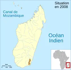 This species is endemic to southeastern Madagascar and is known from Midongy du sud National Park south to Andohahela National Park.[1][7] It occurs in pristine and degraded forests, usually in mature ones, with one record from an open area next to a relict forest. It lives in fast-flowing, rocky streams at elevations of 50–1,000 m (160–3,280 ft) above sea level.[1]