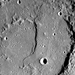 Boethius is filled with smooth plains material, covering its original surface, and it has been subsequently deformed by a scarp.[3] Boethius is one of 110 peak ring basins on Mercury,[4] but only the northern arc of the peak ring is visible. Hollows are present on the arc of mountains.