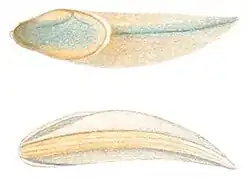 The shell is small, fragile, 1.5–3 x 0.8–1.5 mm, with median nucleus and growth lines, denser in the posterior part, no thin margin, located below the very terminal section of the pointed end of the mantle.[10]