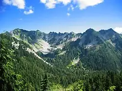 Bogachiel Peak is a 5,478-foot (1,670 m) peak in the Olympic Mountains of Washington, U.S.. It is located in Olympic National Park, and is a high point on the High Divide separating the Hoh River and Sol Duc River valleys, and forming the southern rim of Seven Lakes Basin. The peak is situated at the headwaters of the Bogachiel River. The name "Bogachiel" is a corruption of the Quileute words bo qwa tcheel el, or /boqʷač'íʔl/, from /bó:q'ʷa/, "muddy", and /číʔlowa/, "water", meaning "gets riley [turbid] after a rain", "muddy waters", or, less likely, "big river".[3]