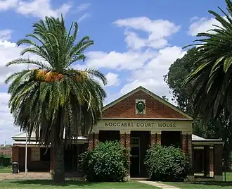 The original town site was 20 km (12 mi) south and settled in the 1830s but was relocated after a flood washed it away in the 1850s.[3] Boggabri comes from Gamilaraay bagaaybaraay, literally "having creeks".[4] It is likely a reference to the Namoi River, which passes through Boggabri.