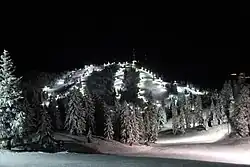 At mid-mountain, a second day lodge (Pioneer Lodge - 1973) sits at 6,800 feet (2,070 m) with a sizable parking lot, a cluster of condominia (1975),[4] and the Jason Harper Training Center. From the Pioneer area, there is direct access to the gentle south-facing slopes served by a high-speed quad chairlift, Morning Star (#2) and the north-facing slopes of the Bitterroot (#5), a quad chair lift (vertical: 525 ft (160 m)), which runs only on weekends and holidays. In addition, there is connecting trail access to the base of the Superior Express (#3) lift. With its 1,500-foot (457 m) vertical rise, the Superior Express serves the advanced and expert terrain on the northern face of Shafer Butte, unloading at 7,480 feet (2,280 m). It replaced a Riblet double chairlift built in 1965,[12][13] and cut the ride time of the original lift in half.[14] Night skiing was added to the Superior area with the installation of lights in the summer of 1986, and Morning Star was converted from a double to a triple chairlift in 1999.