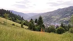 The village of Bohdan is located in the Ukrainian Carpathians, in the center of the Rakhiv District of the Zakarpattia Oblast. The village is located on the floodplain of the White Tisza River (a tributary of the Tisza, the Danube basin), in the valley between the Chornohora and Rakhiv Mountains.[4][5]
