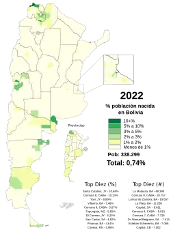 The Permanent Assembly for Human Rights of Bolivia considers that there are over 3 million Bolivian citizens living in different foreign countries.[3] Of these, migration to Argentina accounts for 73% of the total, being the largest Bolivian diaspora group abroad.[4] Today, it is estimated that more than 338.000 Bolivians reside in Argentina.[1]