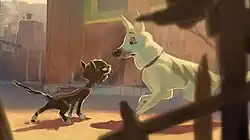 In New York, Bolt resumes his search for Penny. Much to his dismay and confusion, he finds out the hard way that his "superpowers" are useless. He met three friendly pigeons who tell him that there is an animal close to Calico. Bolt encounters Mittens, a cynical female feral cat who bullies pigeons out of their food. Believing that Mittens is an “agent” of Calico, Bolt holds her over the freeway, but Mittens decides to help him. To prevent Mittens from escaping, Bolt ties her to him with a leash and forces her to guide him back to Penny. Mittens is convinced her captor is a lunatic, but the two start their journey westward to Ohio by truck. Meanwhile, in Hollywood, Penny is genuinely distraught over Bolt’s disappearance but her agent agrees to find Bolt.