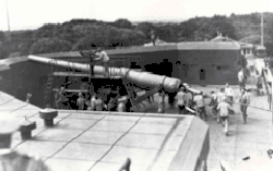 Tagami ordered the deck gun crew to open fire on Fort Stevens' Battery Russell. Surprisingly, his shots were harmless, in part because the fort's commander, Colonel Carl S. Doney,[3] ordered an immediate blackout. Doney also refused to permit his men to return fire, which would have revealed their position. Spotting the enemy gun flashes with a depression position finder indicated the submarine was out of range.[4]