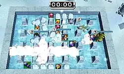 The multiplayer mode was similar to previous Bomberman titles, as up to four players would participate across battle arenas in local battles. Up to eight players could compete via an online connection with new mechanics such as the "Life System", which allowed players to extend the lifebar of their characters at the playfield and survive attacks from rivals or act as a handicap for newcomers.[1][2][3][4]