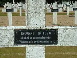 Grave of an unidentified victim of the 23 September bombardment at Chauvinière Cemetery. | |