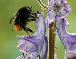 The bumblebee predominantly forages on flowers such as Vaccinium, Lamiaceae, Scrophulariaceae and Fabaceae.[4] According to Goulson, this species is an opportunistic nectar robber. The bees cut a hole into the back of the flower to access nectar, and so they do not participate in pollination.[7]