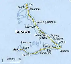 Bonriki is a settlement on Tarawa atoll, Kiribati, near Temwaiku and is part of the municipality of South Tarawa. It is in the south-east of South Tarawa.[1] Bonriki International Airport, one of two international airports in Kiribati, is located here. One of the first roads linking islands together in Tarawa connects Bonriki to Bikenibeu.[2]