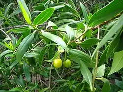 Bontia daphnoides is a shrub or small tree sometimes growing to a height of 5 metres (20 ft) with a trunk up to 15 centimetres (6 in) in diameter. The bark is light brown, thick and grooved. Its leaves are arranged alternately, mostly 62–108 millimetres (2–4 in) long, 14–22 millimetres (0.6–0.9 in) wide, elliptic in shape with a mid-vein visible on the lower surface. They are crowded on the ends of the branches and have many small oil glands.[1][3]