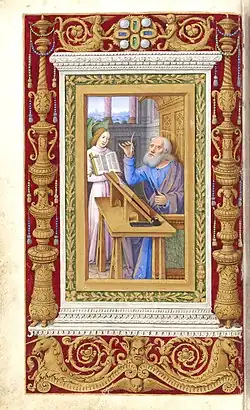 In France, the book was then decorated with great care.[2] The rich decoration of the book is the result of a close cooperation between three artists, Ioan Todeschino and the French artists Jean Bourdichon and an artist known by a notname as the Master of Claude de France, who in between them in the book combined the French-Flemish tradition with that of the Venetian Renaissance.[1] The full-page miniatures, 62 in total, were made by Bourdichon.[4] Unusually, they were painted on separate rectangles of thin parchment which was then glued onto the pages of the book.[3] The border decoration was then made by Todeschino and the Master of Claude de France.[5]
