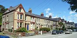 In the Victorian period, terraces again became regular, then in the mid-Victorian period the Italianate style introduced entirely random variations between houses.[1] The heyday of the bookend style was in the late-Victorian of the 1870s and 1880s, by which time domestic architecture had developed its own indigenous vernacular style.[2] The ever-increasing demand for housing in the growing cities of this period led to house sizes shrinking, to match the shrinking households of fewer, and non-resident servants. Many of these new houses were of two storeys, not the previous three-plus-basement. This led to the most familiar style of bookend terrace: a row of between six and twelve houses in total, with the central ones being of two storeys with a longitudinal roof ridge. At each end is a house of the overall same plot size, but of three storeys and with its own independent roof and gables to front and back. The upper storey in these houses have two bedrooms, with sloping ceilings to their sides immediately beneath the roof, rather than having an attic space above. Prestige features, such as bay windows, may be more prominent in the end terraces; either fitted to the end houses alone, or used on both storeys rather than just the ground floor. As there is side access to the end houses, their main 'front' doors are often relocated to the ends walls and may be enclosed in a small porch, while the central houses have their door opening directly to the exterior.