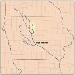 The Boone River is a tributary of the Des Moines River in north-central Iowa in the United States. It is 111 miles (179 km) long[2] and drains an area of 895 square miles (2,320 km2).[3] Via the Des Moines River, it is part of the watershed of the Mississippi River.