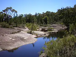 Boonoo Boonoo River rises on the slopes of the Great Dividing Range, near Boonoo Boonoo and Mount Lindesay Highway, and generally flows northeast, joined by seven minor tributaries before reaching its confluence with the Maryland River, east of Rivertree. The river descends 706 metres (2,316 ft) over its 44 kilometres (27 mi) course;[2] and flows through the Bald Rock National Park and the Boonoo Boonoo National Park, descending through Boonoo Boonoo Falls in its upper reaches.
