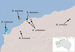 The westernmost species, B. capensis, occurs throughout the North West Cape. B. furcosus is known from Mount Minnie, in the Pilbara region. B. undulatus and B. delicatus co-occur in an area of Pilbara, the only two sympatric species of the genus. Furthest east is B. curiosus is only known from the Mount Elvire area in Pilbara. The sixth species, B. dubitalis, occurs only on Barrow Island, where it is widespread and abundant.[2]