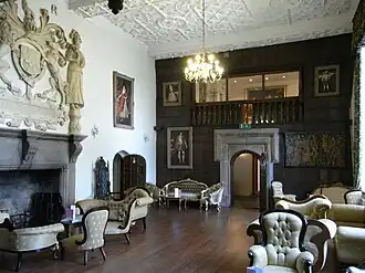 Many of the door-frames are of granite, yet are not in their original positions, for example that now forming the entrance to the great hall from the screens passage, which has been removed, was formerly in the south-east room, where it had been used as a fireplace.[3] The ornate plaster ceiling of the great hall is said by Pevsner to be a modern pastiche, albeit well-executed. At each end of the hall is a gallery.