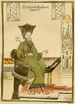 Boris was the son of Feodor Ivanovich Godunov "Krivoy" (lit. 'the one-eyed', died c. 1568–1570) and his wife Stepanida Ivanovna.[5] His older brother Vasily died young and without issue. There is a version according to which the Godunovs were descended from the Tatar murza Chet, who came to Russia in 1330 during the reign of Ivan Kalita. This version was included in later editions of the 16th-century Gosudarev Rodoslovets, but historians have raised doubts about this version of Godunov's ancestry due to various chronological and genealogical issues.[6][7]