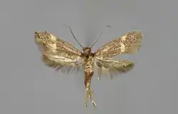 This is a small moth, with a wingspan of 10–14 millimetres (0.39–0.55 in). Its overall coloration is a dark and somewhat metallic slate grey, with two large pale yellow markings on each forewing.Meyrick describes it - Forewings dark fuscous; a transverse ochreous-yellow tornal spot, and a smaller one on costa beyond it. Hindwings grey. Larva whitish; head pale brown; plate of 2 pale 3 yellow- brown.[3]