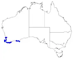 The shrub occurs in Southwest Australia, with most records located at coastal areas. The disjunct records are from Esperance Plains, Jarrah Forest, Swan Coastal Plain and Warren biogeographic regions. The habitat is dense vegetation on sand at dunes and limestone cliffs.[4]