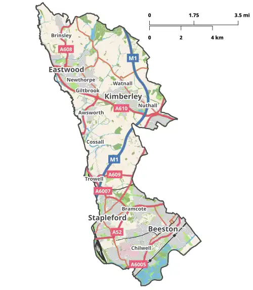Settlements include Beeston—where the council is based—Attenborough, Awsworth, Bramcote, Brinsley, Chilwell, Cossall, Eastwood, Giltbrook, Greasley, Kimberley, Moorgreen, Newthorpe, Nuthall, Stapleford, Strelley, Swingate, Toton, Trowell and Watnall. Additionally a small part of Wollaton falls within Broxtowe.
