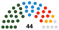 Since the last full review of boundaries took effect in 2015, the council has comprised 44 councillors elected from 20 wards, with each ward electing one, two or three councillors.[26]