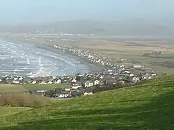 There is an ancient submerged forest visible at low tide along the beach, where stumps of oak, pine, birch, willow and hazel (preserved by the acid anaerobic conditions in the peat) can be seen. Radiocarbon dating suggests the trees date from about 1500 BCE.[3] This submerged forest[4] also ties in with the legend of Cantre'r Gwaelod.[5][6] The stumps were exposed for a time by Storm Hannah in 2019.[7]