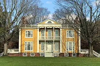 While in London he associated with many wealthy members of society and acquired their tastes, particularly for the neoclassical buildings of Robert Adam. He bought many furnishings and decorative objects, such as a Wedgwood dinner service, and had them shipped back to the United States with him.[3] With the interest on a sizable life annuity granted him by Sir William Erskine, Dyckman intended to form an estate on 250 acres (1 km2) near Montrose and named it Boscobel, perhaps after Boscobel House in Shropshire (itself named for the Italianate bosco bello, "pretty woodland"), symbolizing his Anglophilia.[6] According to one biographer, he saw himself as a "conspicuously well-fixed farmer, surrounded with objects of taste...who did not farm too seriously".[1] He began this process by marrying Elizabeth Corne, daughter of another Loyalist family, in 1794. But within a year he faced financial difficulties, the halt of Erskine's annuity by his heirs after his death and his own lavish tastes and generous gifts to less fortunate family members contributing to reduce his circumstances.