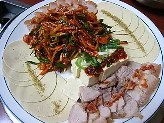 Bossam (Korean보쌈) is a pork dish in Korean cuisine. It usually consists of pork shoulder that is boiled in spices and thinly sliced.[1] The meat is served with side dishes such as spicy radish salad, sliced raw garlic, ssamjang (wrap sauce), saeu-jeot (salted shrimp), kimchi, and ssam (wrap) vegetables such as lettuce, kkaennip (perilla leaves), and inner leaves of a napa cabbage.[2][3]
