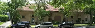 The Boston Edison Power Station stands on the south side of Homer Street, just west of the Newton Free Library and across the street from the Newton City Hall and War Memorial. It is a single-story structure, finished in stucco and brick, with a flattened hip roof. The angled portion of the roof is red tile, with exposed rafter ends in the eaves below. The corners of the building have brick quoining, which also articulate the major sections of the facade. The facade is divided into three sections, with the entrance in the left section, framed by an elaborate temple-like surround. The right section has a window in a similar position, with a less elaborate surround. The narrow central section has a bricked-over garage-style entrance, framed by a leaf-molded cast stone surround.[2]