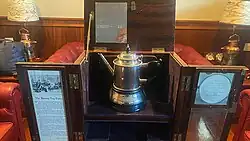 The replica trophy is approximately 30 centimetres (12 in) high and 15 centimetres (5.9 in) in diameter with an additional silver base engraved with "The Boston Teapot",[10] and housed in a custom protective wooden box, 40cm x 40cm x 20cm (16in x 16in x 8 in), with a blue velvet lining.[11]
