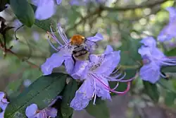 Bumblebee pollinating Rhododendron flower in woodland area with acid soil