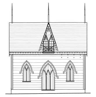 One of these buildings is a 1 1/2-story icehouse, built out of wood on a partial basement with tabby walls. The building has a high gable roof oriented north–south; on the east and west sides are high triangular dormers, each with two pointed windows and a small balcony. Three-level wooden spires, topped with pendants, rise from the peaks of the gables and the dormers. The roof is slightly flared at the eaves. Barge boards cut in circular designs decorate the gable eaves; boards decorated with dentils run below the eaves on the east and west sides of the building. The north and south ends both have two doors: one at ground level and one in the gable. Two paneless windows closed by narrow shutters flank each of the lower-level windows. On the east and west sides of the building are mock Gothic doors and windows.[6]