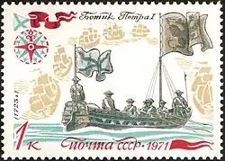 Peter the Great ordered that the boat be displayed in the Kremlin in 1722 in honor of the Peace of Nystad.[1] His botik was placed outside the Dormition Cathedral, Moscow.[8] It was moved from there to the Alexander Nevsky Monastery in May 1723.[1][3] Peter sailed the boat down the Neva River on his birthday, 30 May 1723, along with a convoy of yachts and other ships of the Admiralty.[1] In August of the same year, Peter sailed the boat in a regatta of the Baltic Fleet from St. Petersburg to Kronshtadt.[1] The boat was placed in the kronverk of the Peter and Paul Fortress on a plinth, inscribed with the words "From the amusement of the child came the triumph of the man".[1][3] After the boat took part in ceremonies on the third anniversary of the Peace of Nystad, 30 August 1724, Peter ordered that it be sailed or rowed to the Alexander Nevsky Monastery every year on 30 August.[1]