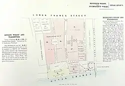 In the 16th century the wharf was used by the Muscovy Company for their trade between England and Muscovy.[10] A century later it was owned by the Corporation of London and was leased to Sir Josiah Child in 1666.[11] By the mid-18th century the East India Company had a warehouse there.[12] As well as being a site for the shipment of cargoes, it was also a destination and departure point for passenger vessels bound for North Kent; in 1819 a packet boat travelled from there to Gravesend, from where connections could be made to Ostend in Belgium,[13] and by 1834 a hoy regularly travelled from there to Whitstable.[12] It was the central point of arrival into London for all travellers coming from Gravesend by river boat, including many who had come from continental Europe, and a "public kitchen" existed there to provide sustenance to the hungry arrivals.[14] By this time the wharf's buildings were very old and hazardous, as James Thomas Loveday noted in his 1857 London Waterside Surveys For the Use of Fire Insurance Companies; he wrote that "in the event of a fire at any part, but little hope could be entertained of saving any portion of the premises."[15]