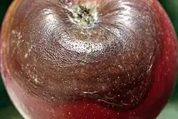 Botryosphaeria obtusa enters the fruit through wounds. These can be made by insects, birds or growth cracks. At first a brown spot, near the calyx, appears on the fruit.[2] The spot on the fruit then enlarges and black/brown rings appear on the fruit. The fruit holds its shape, however, unlike other fruit diseases. The fruit will then wither up and can remain on the tree for another year before falling off. During this time pycnidia appear on the surface of the rotted fruit.[1]