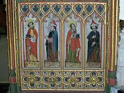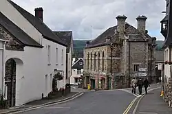 The town has over a hundred listed buildings.[13] The parish church, at the top of the town, is grade I listed.[14] It has a tower dating from the 14th century, many 15th-century carvings including three misericords and a screen described by Arthur Mee as "one of the finest in this county of fine screens".[15] The screen was restored in 1887 with the central panels the work of Charles Edgar Buckeridge.[16] The church has an unbroken list of vicars from 1258. On Hind Street, the East Dartmoor Baptist Church was built in 1824 and is now grade II listed. The church was founded by workers in the Bovey Potteries.[17] Bovey Tracey Town Hall was completed in 1866.[18]