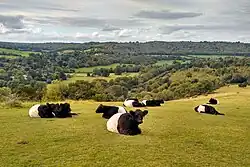 The soil covering the north- and south-facing chalk slopes of the hill is too thin and insufficiently fertile to allow cultivation. These areas are indicated as sheep-walk on the 1801 map and were used as pasture, especially during the winter months when lower ground was too wet for productive grazing.[34] Grazing of these slopes has continued into the 21st century and a herd of Belted Galloway cattle is used by both Surrey Wildlife Trust and the National Trust to control growth of grasses, thereby allowing wild flowers (including orchids) to flourish.[36][37]