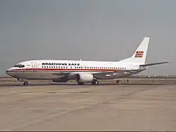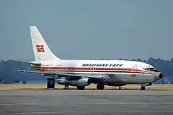 From the establishment, Braathens SAFE's aircraft livery had a thick red and thinner white and blue cheatline, with the Flag of Norway on the vertical stabilizer.[95] With only slight modifications, this general design was continued to and including the 737-400 and -500 aircraft.[96] A new livery with a stylized grey wing as logo on the vertical stabilizer and a blue belly was introduced in 1998 with the delivery of the 737-700.[67] The logo was replaced with the Flag of Norway in 1999.[76][77] Only some of the early Douglas aircraft were named, and those that were started with "Norse". The Heron were given common Norwegian male names. The three last F-27 and newer aircraft were all named for kings of Norway.[93]