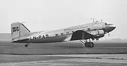 Charter flights to Europe using Douglas DC-6 aircraft started in 1950. The airline applied for and was granted permission to fly from Oslo via Tønsberg Airport, Jarlsberg to Stavanger. Braathens acquired de Havilland Heron aircraft to operate the route.[13] Permission to fly from Oslo to Trondheim Airport, Lade was granted in 1953, a route also served by SAS. Termination of Far East routes led to a 90% drop in revenue and the airline made several unsuccessful applications for new routes.[14] They were successful in obtaining permission include stopovers on Oslo–Stavanger services at Kristiansand Airport, Kjevik and Farsund Airport, Lista. From 1956 stopovers took place at Hamar Airport, Stafsberg and Notodden Airport, Tuven, but these only lasted until 1959. By then it had added Røros Airport to its destinations.[15] Following the bankruptcy of West Norway Airlines in 1957 and the opening of Ålesund Airport, Vigra the following year, concessions were reshuffled, and Braathens was granted a monopoly on services to Ålesund and between Trondheim and Bergen, while it and SAS would compete on services between Oslo and Stavanger, Kristiansand and Trondheim.[16]
